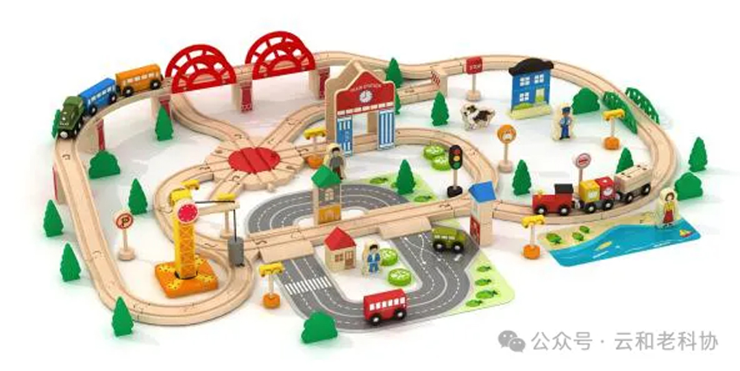 5.轨道积木:带凹槽的木条与车轮组合,模拟真实轨道,激发工程思维,是初步探索物理因果关系的玩具。